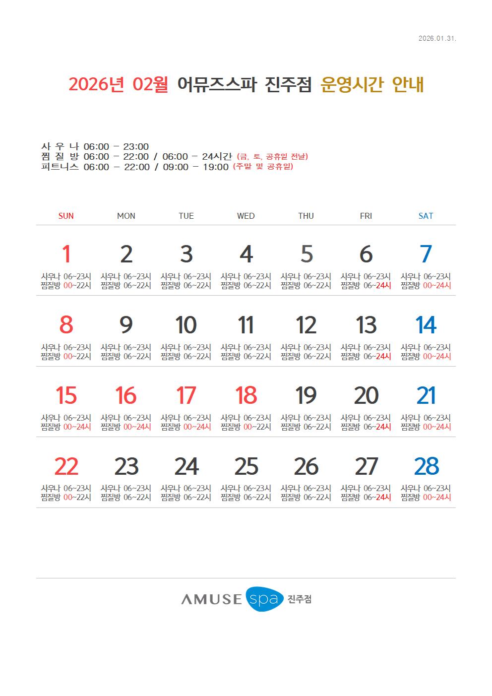 어뮤즈스파진주점 2026년 2월 운영시간표 안내